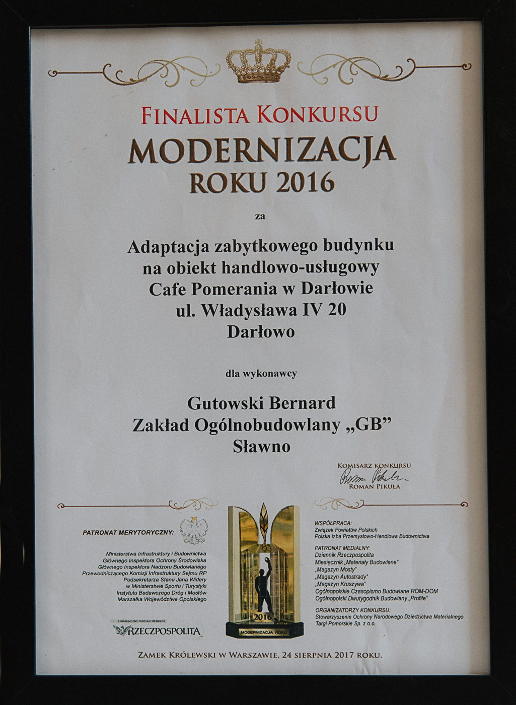 Roboty zostały wykonane zgodnie z ustalonymi terminami i wymogami Zamawiającego. Firma wykazała sie dużą znajomością sztuki budowlanej, profesjonalnością i starannością. Firma Panana Bernarda Gutowskiego jako Wykonawca, za wykonanie prac została wyróżniona w Ogólnopolskim Konkursie „Modernizacja Roku 2016”. Polecam Zakład Ogólnobudowlany „GB” z siedzibą w Sławnie jako firmę rzetelną i należycie wywiązującą się z powierzonych zadań.
